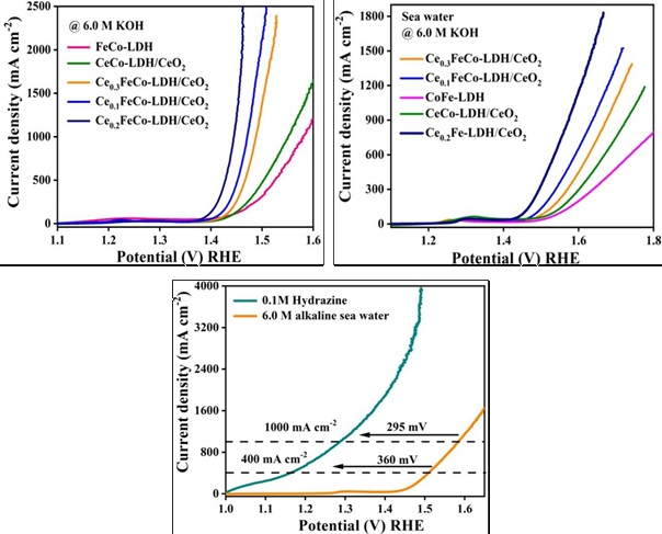 we have developed different layered double hydroxide (LDH)-based catalysts, which can produce high activity for seawater oxidation under industrial conditions. In 6.0 M KOH seawater electrolyte, the catalyst requires only 250 mV over potential to achieve an industrial-scale current density of 500 mA cm -2. In an alkaline seawater electrolyte, this multi-metallic electro catalyst stands out as one of the most efficient transition-metal-based OER electro catalysts reported to date, thus advancing the progress of seawater electrolysis technology. Interestingly, our catalyst achieved a current density of 2.5 A cm -2, a remarkable high value in this field.