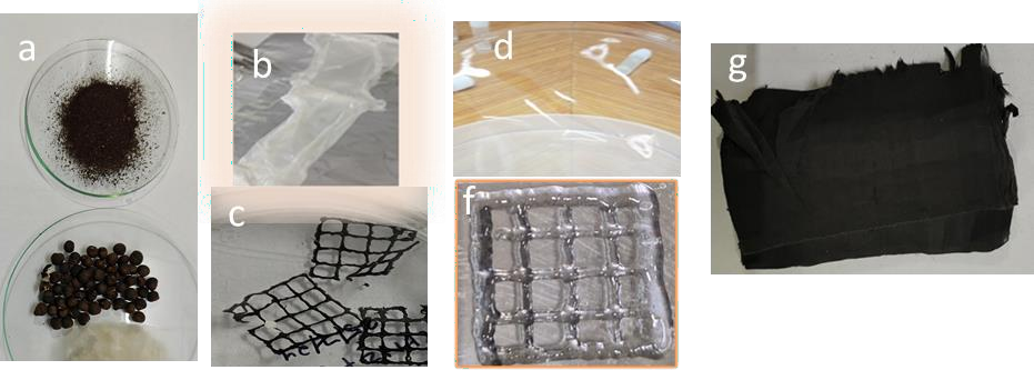The research is mainly focused on designing electrode and catalyst materials from sustainable resources as well as bio mimicking them through advanced process methods like electrospinning technology. (Figure a, b). Currently developing Fiber based free standing electrodes for super capacitor and battery in a sustainable manner via choosing the biopolymer based matrix material for carbon matrix formation. (Figure b, d, g). Further, as part of waste utilization, we are targeting agricultural waste materials towards carbon catalysts synthesis for fuel cell and other energy and biomedical related applications. (Figure a, c, g). Recently, we were into the field of designing natural product-based nanofiber mats for sustainable packaging, membrane in water filtration and fuel cell applications and antimicrobial wound healing bandages. We have also formulated the sustainable bio-ink from agriculturally based materials for tissue engineering applications. (Figure a, b, c, d, f, g)